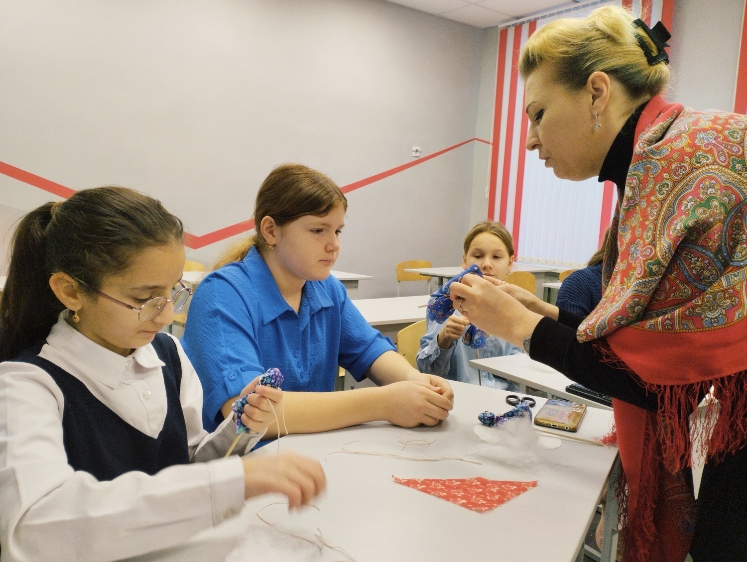 В соседнем кабинете пахло тканью и творчеством! Ученицы 5 класса мастерили текстильных кукол, по руководством Родыгиной А.А. Это был не просто урок рукоделия, а настоящая арт-терапия. Каждая работа получилась уникальной.